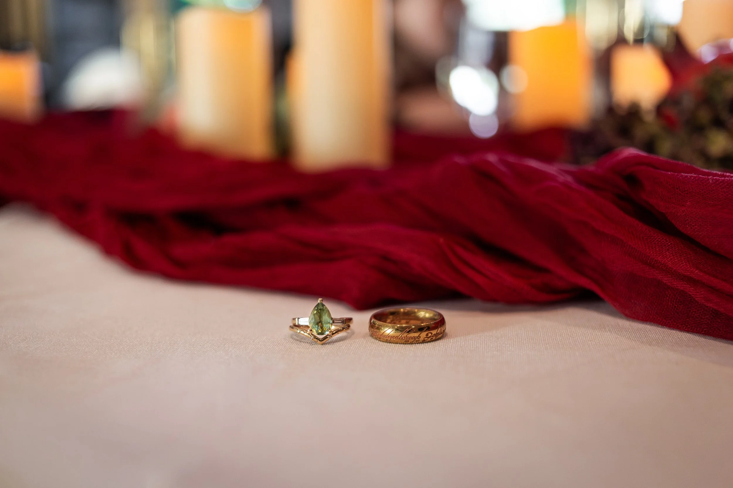 On Jessie’s hand: a wedding band inspired by Lord of the Rings. A small nod to a world of myth and devotion, woven seamlessly into their own love story. On the bride’s feet: her own handmade “night” shoes. A pair of red ballet slippers, carefully painted with both of their first letters and house emblems. It was a subtle but meaningful detail, blending whimsy and intention, and the perfect way to carry a piece of their story with her as the celebration continued.