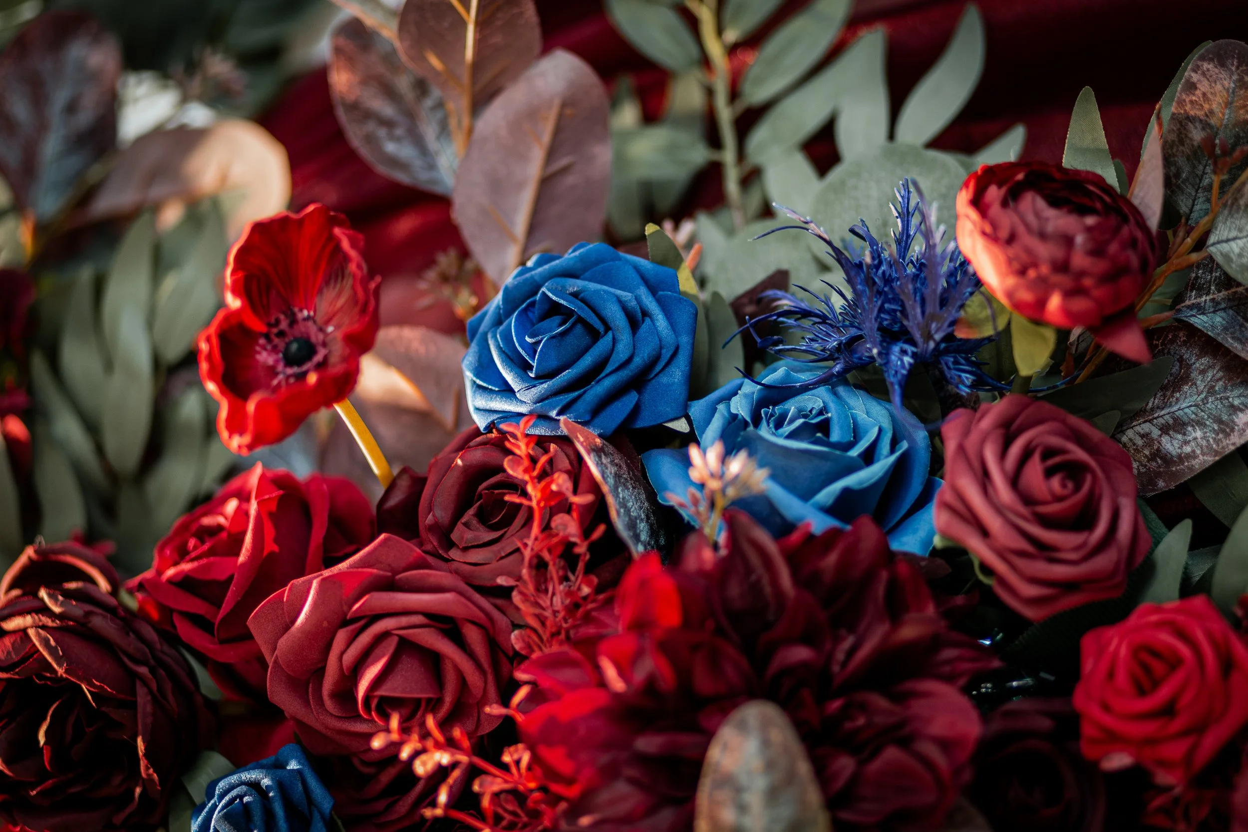And then there were the flowers—classic red roses that are bold and timeless, with whimsy blue ones sprinkled in, anchoring the entire aesthetic together. The deep crimson tones softened the darker palette, creating a balance between intensity and warmth.